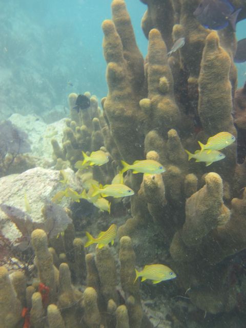 Les USVI sont moins fréquentées que les BVI par les voiliers. Il y a peu de compagnies de location, les mouillages sont moins bien protégés ou payant ou envahis de bouées privées. Les fonds marins sont du coup mieux préservés encore et nous nous régalons de snorkeling grâce aux bouées placées dans des endroits stratégiques, proches de rochers affleurants ou de haut-fonds. Les gorgones et les différents coraux ont encore toutes leurs couleurs et ne sont pas recouverts de mousse comme à beaucoup d'endroits dans les Caraïbes. Avec un peu de soleil, ce sont de vrais paysages qui se déroulent sous nos yeux. C'est un plaisir de photographier ce monde sous-matin, que ce soit une petite "monnaie caraïbe" (sorte d'escargot) sur sa gorgone ou un gros barracuda sous le bateau.