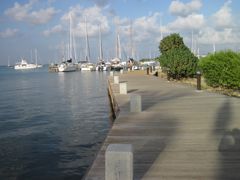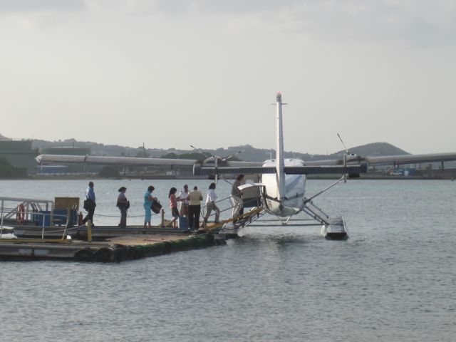 Au bord de l'eau, une promenade en bois relie le quartier historique au débarcadère des hydravions, qui font la navette toutes les 45 min. entre Ste Croix et St-Thomas. Quelques voiliers occupent les pontons devant des bars bien animés le soir. Nous discutons devant un verre avec deux américains établis sur l'île depuis quelques années, fuyant le froid comme nous. Ils nous renseignent sur les curiosités locales, comme ces vieux barbus, nostalgiques de Woodstock, qui vivent sur leur petit voilier aussi barbu qu'eux ancré devant la ville à 50 m des bières fraîches. Nous nous demandons s'ils ont vraiment tous des boîtes à eaux noires ! L'ambiance est totalement à l'opposé de St Thomas (qu'ils surnomment ici St-Trauma) et nous avons le plus grand bateau de la baie... cela fait longtemps que cela n'était plus arrivé !