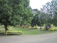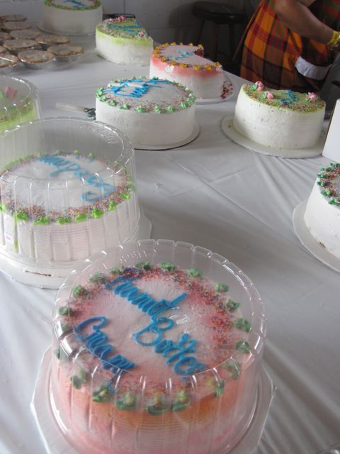 Le lendemain, nous prenons un taxico pour aller au Pueblo et le samedi, un autre pour nous rendre à la grande foire agricole annuelle au centre de l'île. (Plus chers qu'à Grenade, les taxicos sont aussi beaucoup moins nombreux et presque vides. C'est peut-être un moyen d'évaluer la richesse d'une population ? Quand chacun a sa voiture, les taxicos se font rares et les embouteillages plus nombreux. Cela atteint son comble dans les îles françaises.) A la foire, on admire les taureaux, les vaches, les chèvres, les cochons, les coqs... cela nous change des poissons et des tortues. Nous profitons de faire notre marché et d'acheter des tomates "locally grown" si difficiles à trouver et tellement meilleures que celles du Pueblo. A midi, nous cherchons quelque chose à nous mettre sous la dent en nous reposant sous les grands arbres du parc. C'est un peu la déception : après avoir vu tous les slogans et les concours des écoles sur le thème "manger sainement", pas une salade en vue. Nous devons nous contenter d'un "patties", sorte de pâté à la viande passé à la friture vendu dans tous les stands. Et pour le dessert ? Vous prendrez bien un peu de ce gâteau bien léger ?