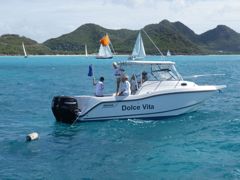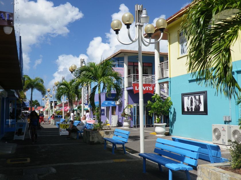 Nous prenons ensuite provisoirement une bouée dans le lagon, qui a un petit air de waterway de Floride, pour aller faire un approvisionnement au supermarché du coin. Comme Jolly Harbour était à l'origine un projet suisse, il en reste quelques traces: on trouve de la moutarde Thomy et de l'Aromat dans les rayons !