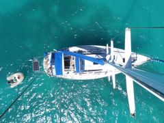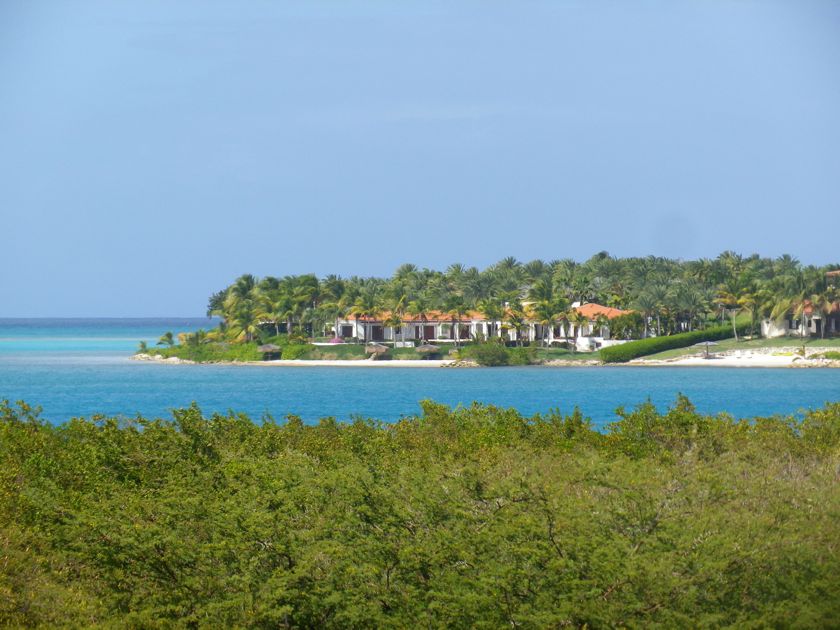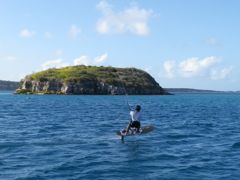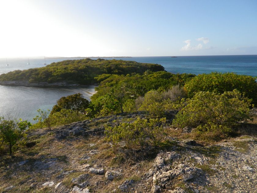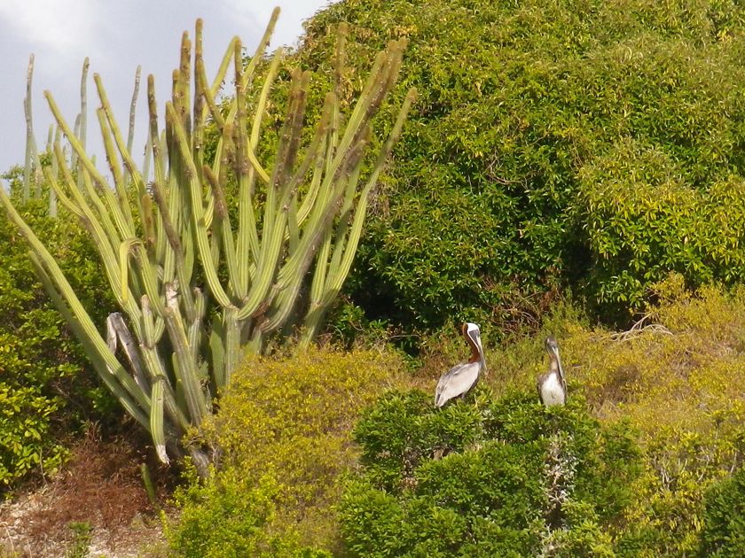 En faisant le tour de l'île dans le sens horaire, il n'y a que quelques milles à faire contre le vent dans le Boon Channel, au nord. Ensuite, on se laisse glisser entre les hauts-fonds plus ou moins balisés, mais correctement situés sur Navionics (vive l'iPad !). Seuls quelques voiliers se rendent dans Parham Sound et nous avons toujours trouvé des mouillages solitaires, derrière une caye ou derrière un îlot comme Red Head Island où nous pouvons observer les pélicans nicher. Les paille-en-queue nous survolent régulièrement en se poursuivant avec leur cri ressemblant à une pompe à eau grippée. Je grimpe au mât pour faire quelques vérifications et quelques photos et nous escaladons aussi Great Bird Island, une fois que les touristes des dayboats sont repartis. La végétation broussailleuse ne permet malheureusement pas d'aller bien loin. De plus, la zone est protégée pour que les oiseaux nichent en paix.