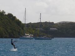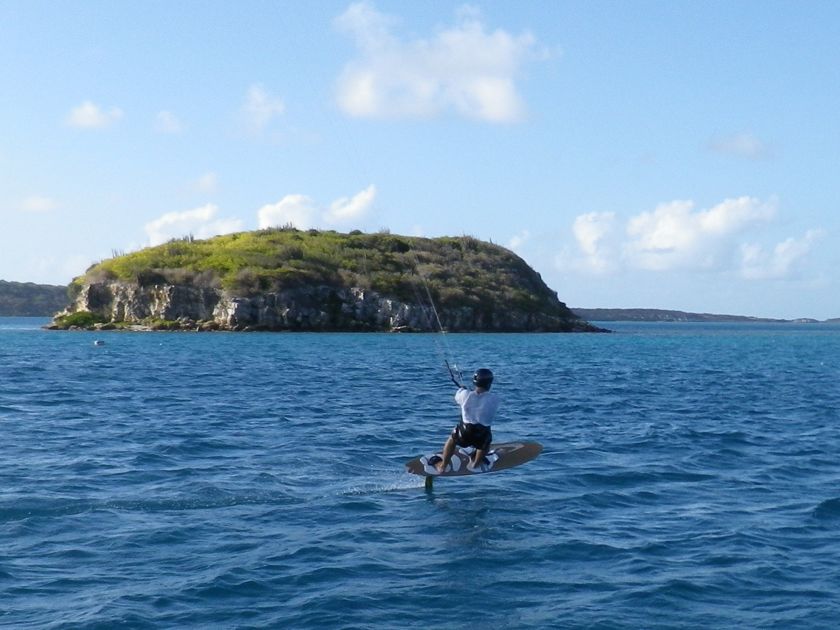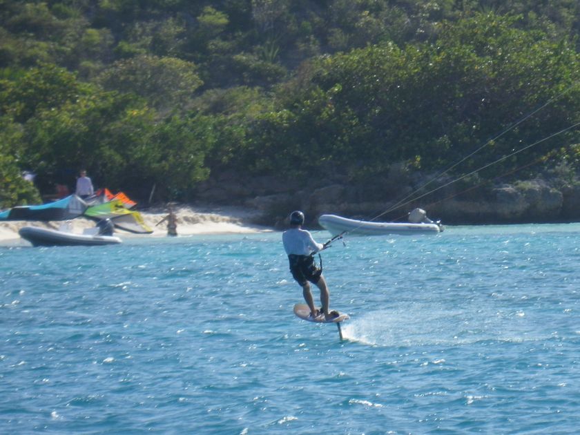 On longe la côte est à la voile pour entrer dans Non Such Bay, un autre lagon beaucoup plus fréquenté, paradis des kitesurfeurs. C'est la première fois qu'on voit un kite à foil !