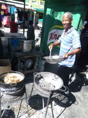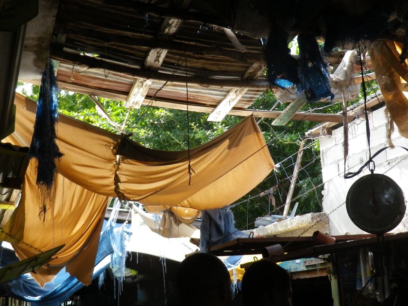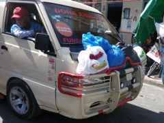 Dans les rues, un camion décharge des oeufs en quantité. Des petites échoppes sponsorisées par Knorr offrent à manger...les grills sont d'anciennes jantes. Après avoir vu les stands de poissons aux yeux glauques et de viande couverte de mouches dans le marché à côté, on n'a pas osé s'installer ! Des guaguas surchargés ramènent les gens dans leur village, le pare-boue rempli de paquets et même ailleurs de poules attachées par les pattes.