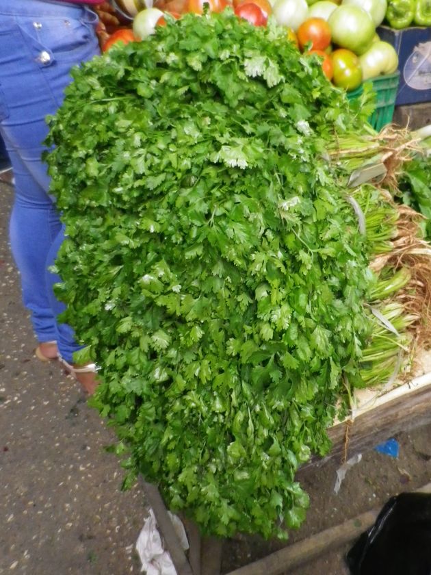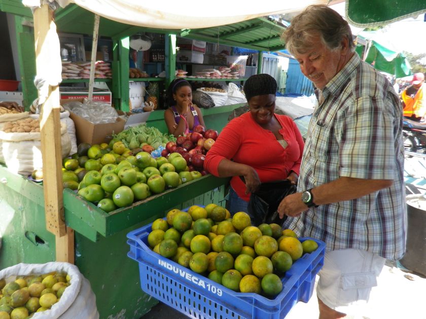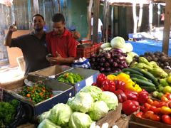 En nous perdant dans les ruelles, nous tombons sur le marché... couvert. Vieilles bâches, vieilles tôles... Je doute que la couverture résiste à une bonne pluie ! Mais depuis que nous sommes en République Dominicaine, il ne pleut pas ! Les légumes sont très beaux et bien présentés. C'est apparemment la saison du coriandre, il y en a des énormes bottes. Les vendeurs aiment plaisanter et se faire prendre en photo. Pierre achète des oranges, douze pour 25 pesos (45 centimes). Il apprend à compter jusqu'à doce avec la vendeuse qui se marre. Nous mettons longtemps à comprendre qu'ici les oranges sont amères et pleines de pépins. Il faut demander des "chino". On croyait que c'était l'inverse !