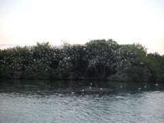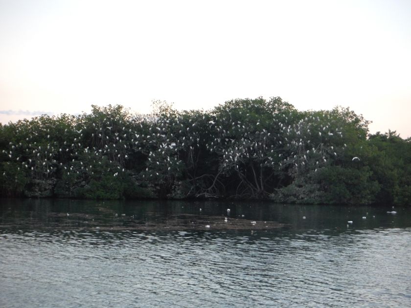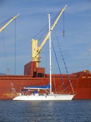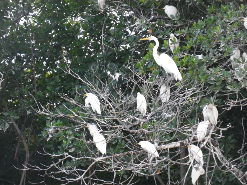 Un matin, à 7h30, on frappe à la coque. On nous avise qu'un gros bateau va entrer dans le mouillage et y rester quelques jours. Il faut sortir pendant la manoeuvre et revenir se mouiller ensuite. Nous pensions avoir le temps de petit-déjeûner mais le son de la corne nous fait accélérer. Nous levons l'ancre... un énorme vraquier est à l'entrée du port, manoeuvré par deux remorqueurs. Nous avons juste le temps de sortir ! Ils auraient pu avertir le jour précédent, non ? Deux heures plus tard, nous retrouvons notre place mais le paysage a changé ! Ce n'était déjà pas génial mais là, c'est la zone industrielle ! Enfin ! C'est ça aussi le voyage... il n'y a pas que les mouillages idylliques ! Pendant quatre jours et nuits, non stop, les grues vont décharger du charbon dans une sorte d'entonnoir qui l'amène sur un tapis roulant. Ceci pour alimenter l'usine électrique toute proche. Bonjour l'écologie ! Heureusement, le vent ne souffle pas dans notre direction ! L'avantage, c'est qu'on entend plus le bruit de la ville !!! Cela ne semble pas déranger les aigrettes (?) (nous on dit les garces car c'est garças en espagnol) qui reviennent tous les soirs à leur place dans la mangrove.
