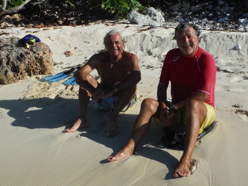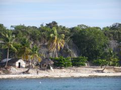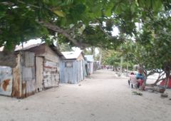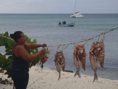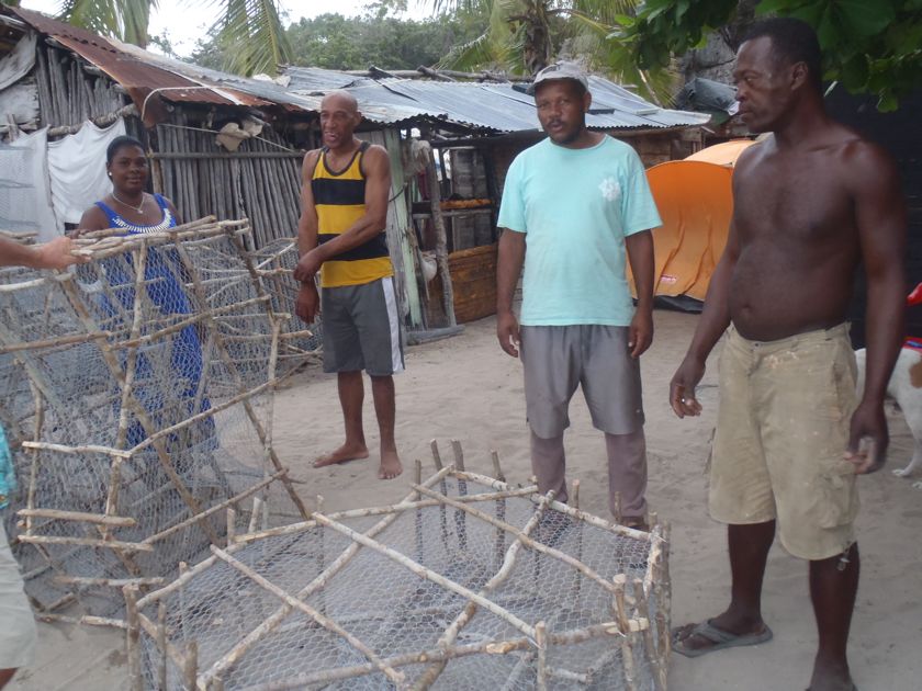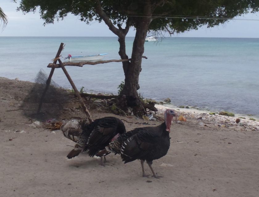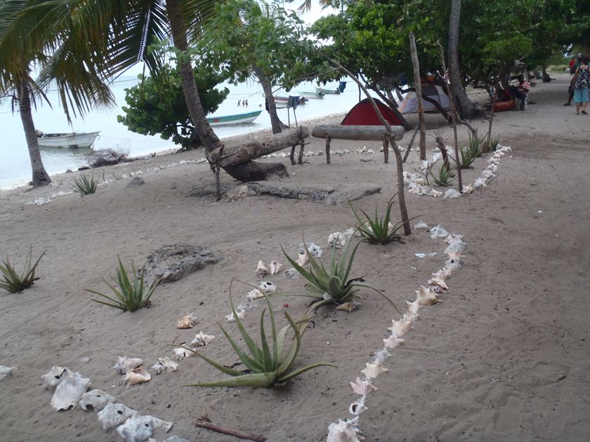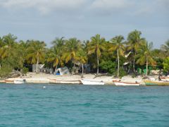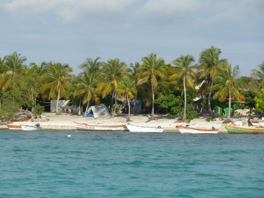 La marine de guerre fait une petite reconnaissance à bord et contrôle notre zarpe pour Haïti. Drôle de marine qui n'a pas de bateau et se fait toujours amener par un pêcheur ! Pas de VHF qui fonctionne non plus ! Nous leur offrons quelques bières et 20 litres d'eau douce, denrée rare sur l'île. Ils nous disent que nous sommes les bienvenus à terre. Nous y allons le lendemain pour récupérer notre bidon. C'est avec étonnement puis enchantement que nous parcourons l'"allée" du village, piste de sable blanc bordée de cabanes de tôles, de bois peint, ou même de tentes. Les pêcheurs vivent là uniquement pour travailler et ne peuvent emmener leur famille. Ils vont tous retourner dans leur village pour Noël et engraissent quelques dindes pour cette occasion ! Les langoustes sont conservées dans des viviers, les poissons dans de la glace, ou séchés au soleil. Parfois, nous voyons un paysage idyllique depuis le bateau et nous sommes déçus par la saleté à terre. Là ce n'est pas le cas, même s'il y a quelques tas de bouteilles égarées. Et surtout, les gens sont ouverts, souriants, prêts à échanger, à nous expliquer leur travail. Je n'ai qu'un regret... que la pile de mon appareil photo ait rendu l'âme à ce moment là ! Heureusement que des copains français m'ont passé leurs photos.