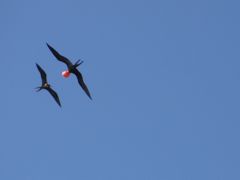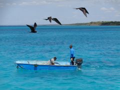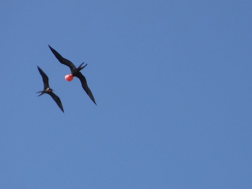 Nous nous arrêtons pour observer les oiseaux. Heureusement, Nicolas, notre guide et propriétaire de Flora Tours, est très intéressant et connaît bien son sujet. Les frégates sont en période d'accouplement et les mâles déploient leur gorge rouge pour attirer les femelles. Les vautours survolent les mogotes à la recherche de proies ou se sèchent les ailes à la manière des cormorans. Pélicans bruns et sternes royales colonisent les piliers d'un ancien ponton.