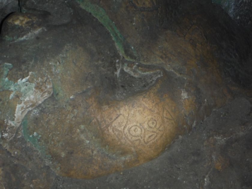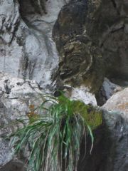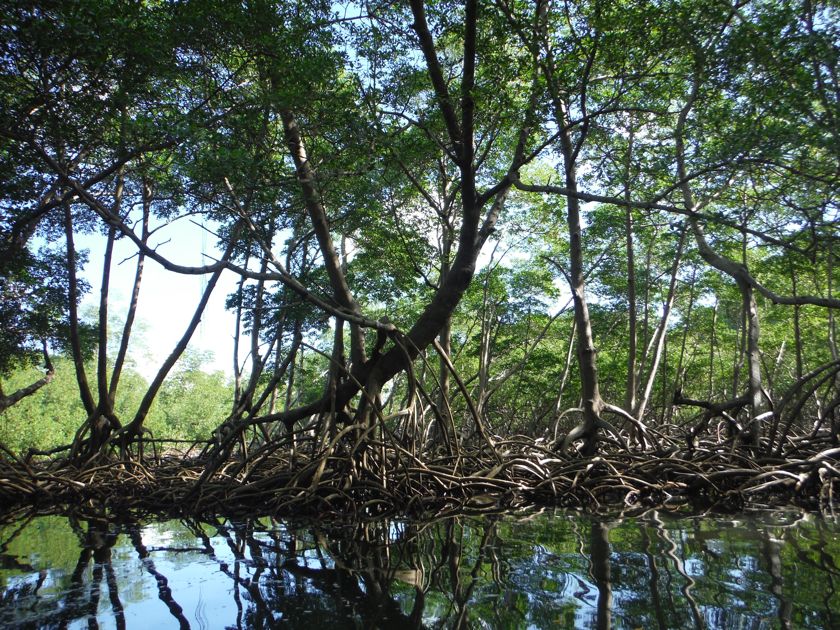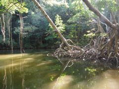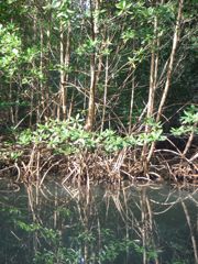 Puis nous traversons une belle mangrove de palétuviers rouges pour visiter notre première grotte et découvrir quelques maigres dessins taïnos. Ces Indiens sont les descendants des Arawaks. Ils ont poursuivi leur route à travers la Caraïbe jusqu'aux grandes îles du nord, Puerto Rico, Hispaniola, Jamaïque et Cuba. Ce peuple pacifique n'a pas résisté à l'arrivée des Indiens Caribe puis des Espagnols. Ceux qui ne sont pas morts au combat ou de maladies contre lesquelles ils n'étaient pas immunisés, se sont suicidés pour éviter de devenir esclaves des envahisseurs. Un des dessins représente le diable. Il tient une croix dans chaque main ! Le diable pour eux était le chrétien... Dans une autre grotte, une chauve-souris est gravée dans la pierre. C'est dans cet animal que se repose l'âme des défunts avant de retrouver un autre corps.