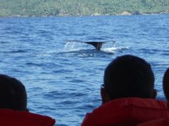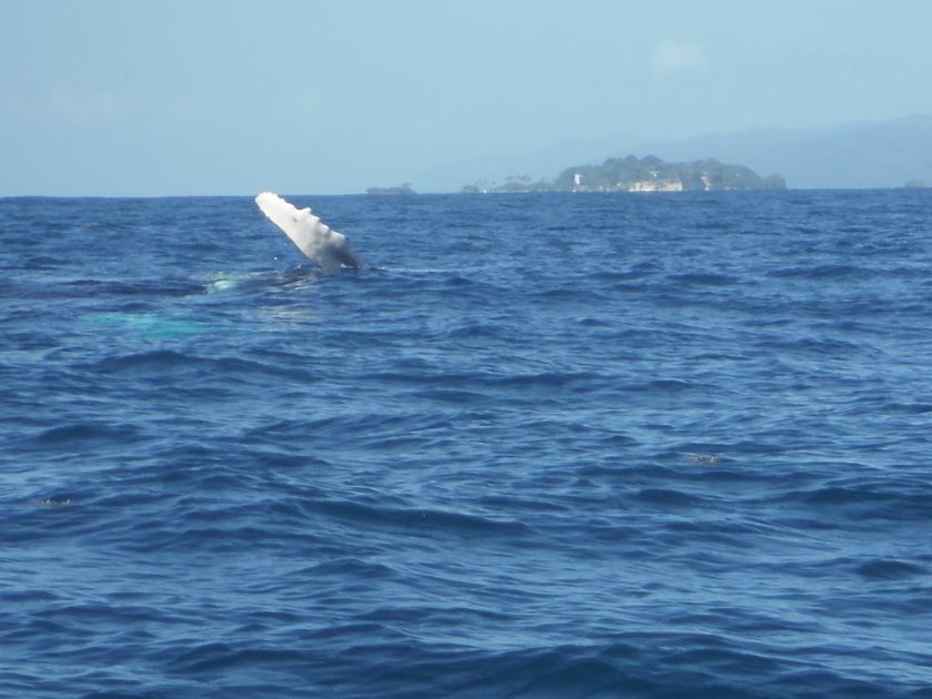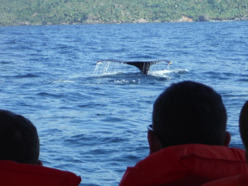 La deuxième excursion nous emmène à Santa Barbara de Samana où, grâce à une autre lancha nous allons voir les baleine à bosse. C'est toujours Nicolas qui nous accompagne et nous explique que chaque année, de mi-janvier à mi-mars, ces cétacés viennent depuis le nord, où ils se sont gavés de planctons et petits poissons pendant l'été, dans les eaux chaudes de la Mer des Caraïbes pour mettre leur petit au monde, ou pour s'accoupler. Grâce aux photos de leur queue, les spécialistes peuvent les reconnaître, et suivre leur périple. Comme les baleines ont une gestation de 12 mois, elles reviennent un an après l'accouplement dans la baie et accouchent à l'aide d'une seconde baleine dite ? Le baleineau, qui ne résisterait pas au froid des eaux du nord, reste proche de sa mère et tète goulûment de 150 à 200 litres par jour ! C'est pour cela que la baleine n'a toujours qu'un baleineau... Nous avons pû suivre pendant une heure une mère, son petit et la ? Malheureusement, les mâles n'étaient pas bien excités ce jour-là et n'ont pas fait de sauts caractéristiques pour attirer les femelles.