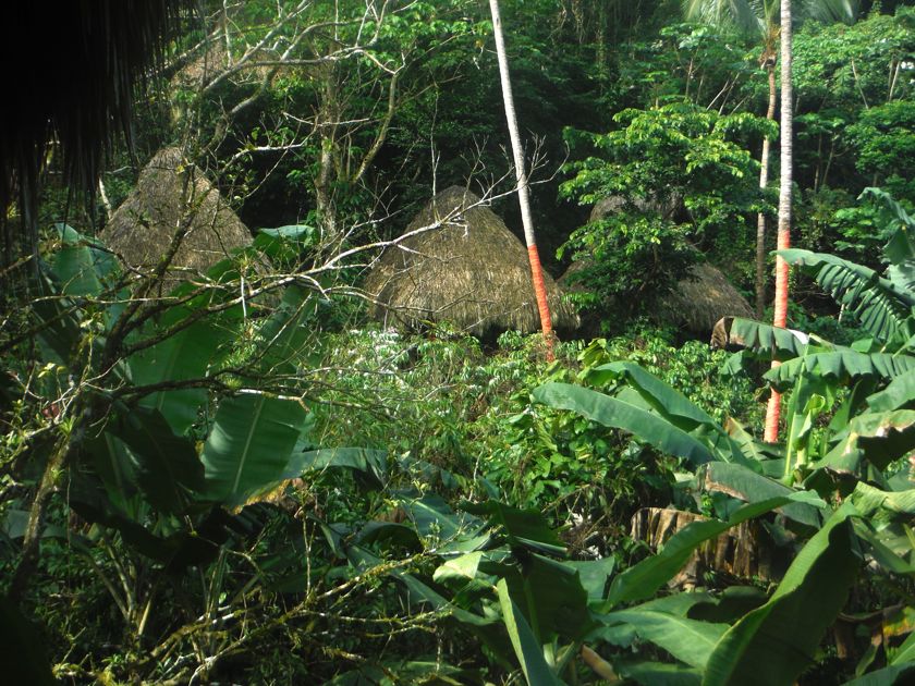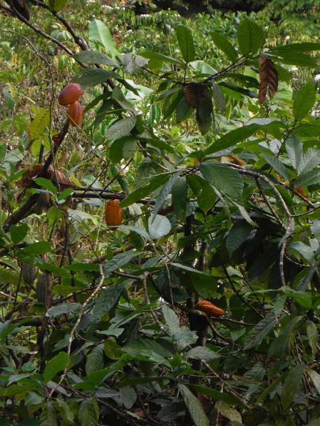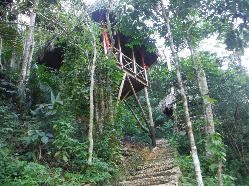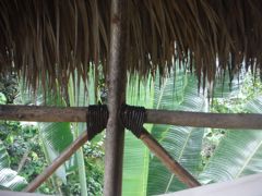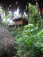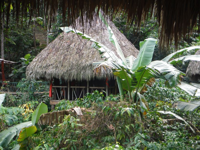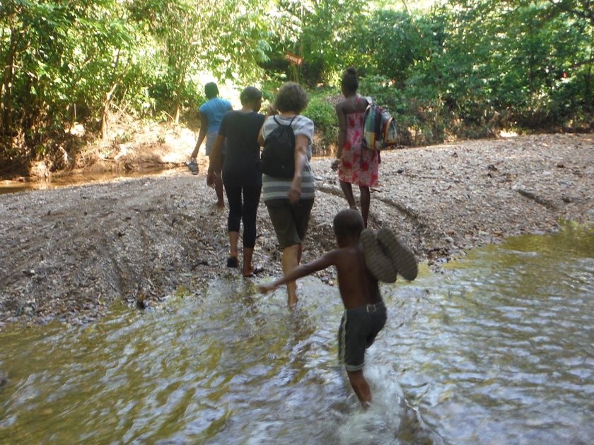 Après le bleu de la mer, le vert de la forêt nous tend les bras... Nous allons faire une cure de chlorophylle dans les arbres du Dominican Tree House ! C'est l'aventure tout de suite... à peine descendues du taxi, un groupe d'enfants nous prend en charge, portant nos bagages et nos souliers car il nous fait traverser trois fois la rivière pour arriver à destination. Mette, une jeune volontaire allemande apprenant l'espagnol pendant six mois dans ce cadre enchanteur, nous accueille avec un verre de bienvenue puis nous montre notre "chambre". Une maisonnette au toit de chaume avec un lit et sa moustiquaire, un gros coffre en bois fermant à clé pour mettre nos affaires, un hamac et c'est tout ! Mais surtout... on a la vue de tous les côtés sur la forêt, les cacaoyers, les caféiers en fleurs. Le bruit des insectes, des grenouilles et des oiseaux nous tient compagnie le soir. Le matin, il y a en plus le bruit des gouttes sur les feuilles car l'humidité est à son maximum. On comprend alors le terme de forêt pluviale !