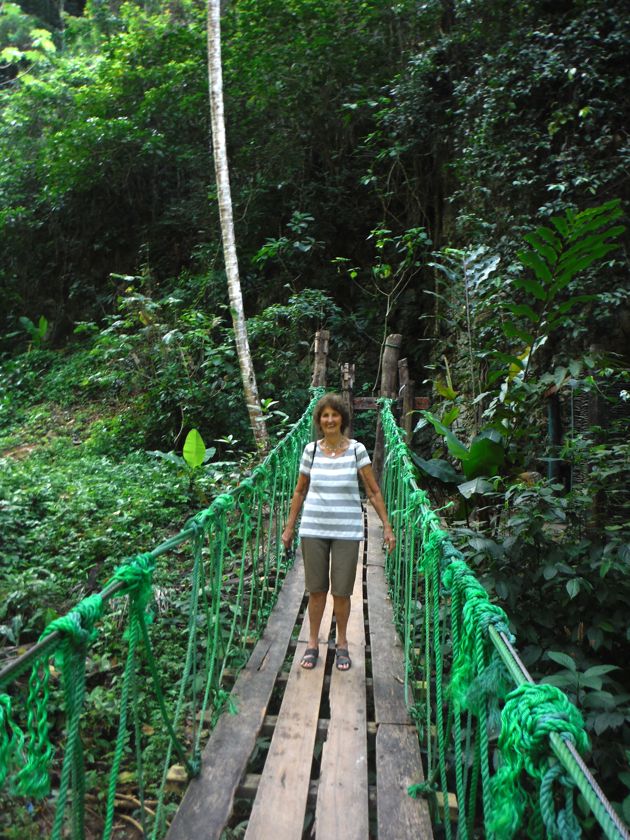 Le lendemain, je me laisse convaincre de tester la zipline. Mette me propose de m'accompagner. Je pensais qu'une navette allait venir nous chercher... mais non ! Nous suivons au pas de charge un des jeunes responsables qui nous accompagne... à pied ! Et ça grimpe sec... sur un sentier... mouillé et bien glissant ! Après 20 minutes d'efforts, nous arrivons à la première station et nous retrouvons Ariel qui aide à l'accueil des Tree Houses quand il n'est pas à la tyrolienne. Il m'équipe et m'explique le parcours : 12 sections... la première faisant environ 400m à 200m au-dessus de la forêt ! A la fin, je me retrouverai à la cascade à côté de l'hôtel. Même pas peur ! Je me régale à survoler la forêt ! Je filme, Mette me filme... à chaque station nous retrouvons les trois Suédois qui nous accompagnent et les jeunes qui descendent en même temps car il n'y a plus de client après nous. Ils font les pitres ! A force de les regarder, j'essaie de me mettre à l'envers comme eux !