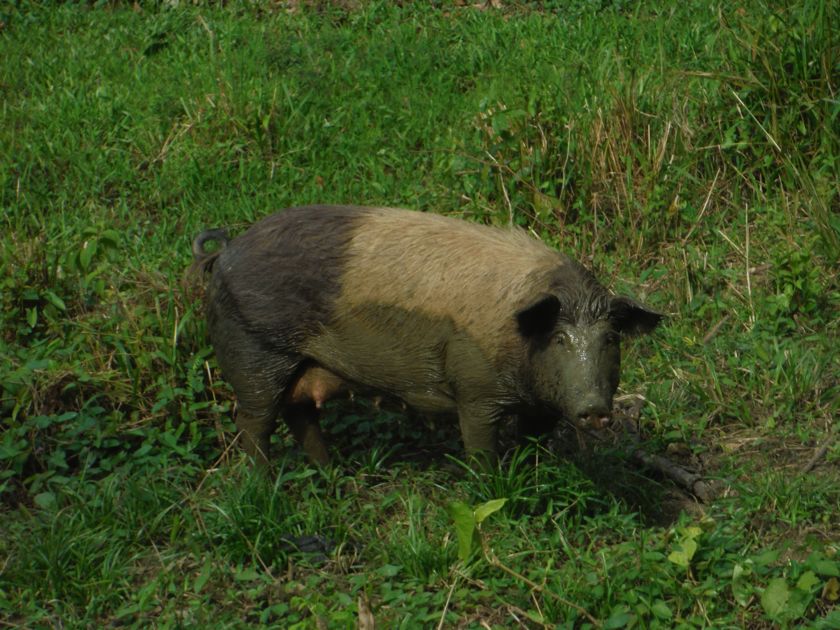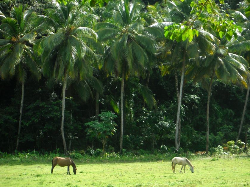 Nous marchons jusqu'à la plage de El Valle. La route en terre passe au milieu de prairies où se prélassent chevaux, vaches, cochons, chèvres, poules. Des cases rudimentaires et colorées sont éparpillées le long du chemin et leurs habitants sont toujours prêts à tailler une bavette et nous expliquer leur travail, comme la cueillette des fêves de cacao, par exemple.
