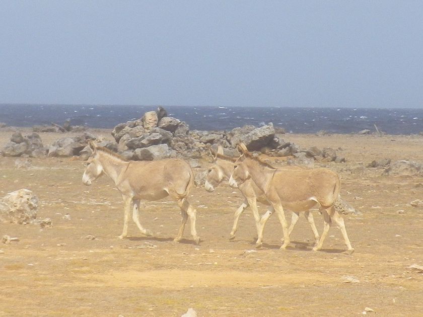 Le nord de l'île est couvert de cactus. C'est le domaine des iguanes, qui figurent au menu de beaucoup de restaurants et que j'ai goûtés lors de notre pause déjeûner. Bon goût de poulet mais quel travail pour trier et recracher les os ! On voit aussi des ânes qui errent sur des plateaux désertiques en bord de mer. Depuis que la machine les a remplacés, ils sont à la retraite, en liberté, et survivent tant bien que mal. Les chèvres broutent les herbes sèches et même certains cactus ! Faut pas être difficile ! Il y a longtemps, elle produisaient une des richesses de l'île, le fumier, exporté par bateau jusqu'à Grenade où il engraissait les champs de cannes à sucre.