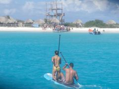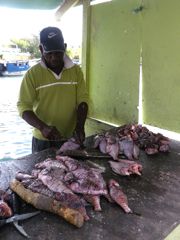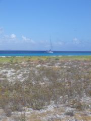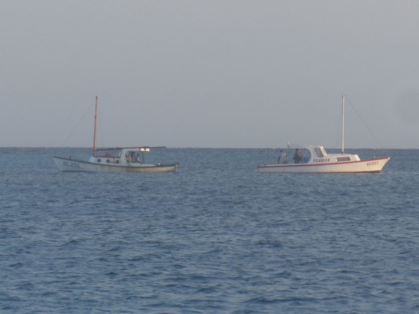 A côté de nous, des pêcheurs ont attaché leur amarre aux tonnes des day-boats pour passer la nuit. Ils pêchent les petits poissons sous le bateau pour avoir des appâts, afin d' attraper plus gros ensuite, le long du tombant. Pierre va discuter avec l'un d'eux et reçoit un petit thon qui nous fera un bon tartare. Ces pêcheurs restent plusierurs jours à Klein Curaçao et conservent les poissons dans des glacières qui occupent la moitié de leur espace sur le bateau. Ils s'arrêtent pour la nuit le long de la plage et repartent au tout petit matin pour une nouvelle journée. Ensuite, ils retournent à Curaçao vendre leurs prises, entre autre au marché local de Spanish Water où nous pouvons nous ravitailler.