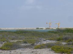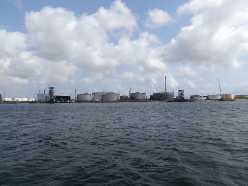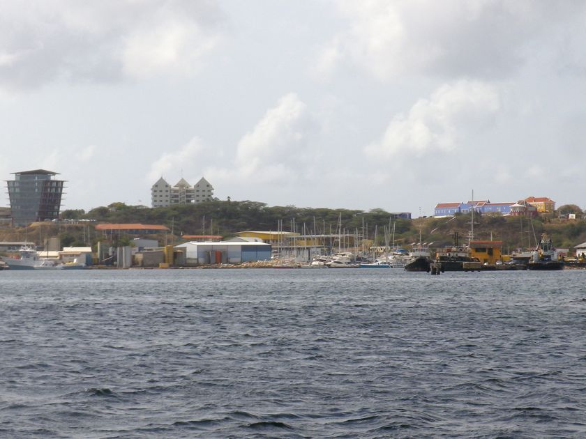 Le 26 mars au matin, nous nous présentons devant le pont qui barre l'entrée de la lagune de Willemstadt et demandons par VHF son ouverture. Posé sur de nombreux pontons flottants en forme de barques, le tablier pivote sur un axe, côté Otrobanda, grâce au moteur de la dernière des barques. Nous nous faufilons sous l'oeil des touristes de passage et le pont se referme derrière nous. Nous quittons la mer pour sept mois et entrons dans le monde du pétrole et des raffineries ! Après une nuit à la petite marina du chantier, un engin extraordinaire sort en un rien de temps Anegada de l'eau. Deux patins sous les fesses et hop ! C'est fait !