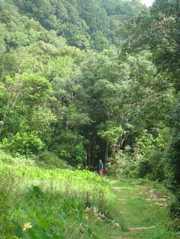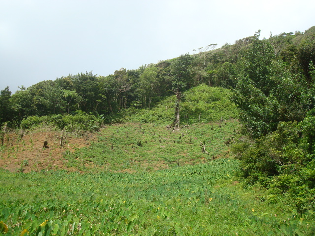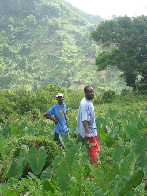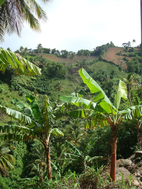 Après une toute petit marche, bien adaptée aux genoux du chef, nous arrivons à Cold Soufrière, quelques gouilles bouillonnantes à l'eau étonnament froide. Nous avions vu cela au sud, derrière Roseau, mais l'eau était bouillante. L'odeur de soufre est bien la même par contre. Nous nous amusons à enregistrer les sifflements, glougloutements, halètements et autres grognements de la terre, accompagnée par les chants des oiseaux au-dessus de nos têtes. Sur le chemin, nous rencontrons des agriculteurs qui désherbent leur champ de madères (dashine). Les tas de mauvaises herbes sont presque plus hauts qu'eux ! Nous leur posons quelques questions sur cette agriculture si particulière de la Dominique : dans ces régions montagneuses, celui qui défriche une terre en a l'usufruit exclusif et elle devient "terre interdite" pour les autres. Le paysage est ainsi une sorte de patchwork entre des cultures, parfois très escarpées, et la forêt tropicale. Sur la route, on croise partout des hommes la machette à la main, allant ou revenant de leur lopin de terre. Ces produits sont écoulés dans les petits commerces locaux ou le samedi au marché de Roseau. Il y a aussi un peu d'exportation vers les îles voisines.