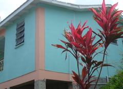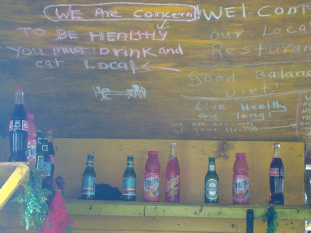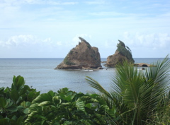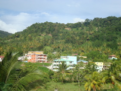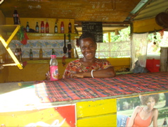 Nous arrivons sur la côte nord-est que nous ne connaissons pas du tout. Surprise ! On dirait la Côte d'Azur sans ses pins. Baies découpées, belles plages et rochers dorés. A Calibishie, nous repérons un petit bar comme on nous les aimons : ouvert à tous vents, coloré, bien situé en face des deux gros rochers émergeant de la baie. Olivia, la propriétaire, nous amène des jus de fruits frais délicieux et nous accueille avec un grand sourire, comme tous le monde dans ce pays où l'habitude est encore de regarder et saluer tous les passants et d'engager la conversation dès que possible en anglais, ou même en français ! La Dominique, située entre la Martinique et la Guadeloupe a connu l'occupation par les français en alternance avec celle des anglais. Nous pouvons nous rendre compte que les efforts developpés pour la santé et une alimentation saine sont parvenus jusqu'ici. A la différence des îles françaises, les slogans ne sont pas sur des affiches coûteuses mais écrits ou dessinés ou encore tagués à même les murs. Le gouvernement fait aussi de gros efforts pour l'environnement. Les plages sont propres et des guides sont formés chaque année pour faire profiter les visiteurs de cette nature encore vierge. Nous discutons avec Olivia qui nous déconseille de continuer notre tour de l'île cet après-midi. Nous ne nous rendons pas bien compte des distances, mais les routes sont tellement mauvaises et pleines de nids de poule que la moyenne horaire n'est pas très élevée ! Nous revenons donc sur Portsmouth par la route principale.