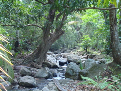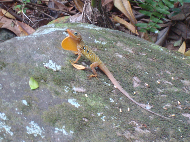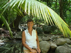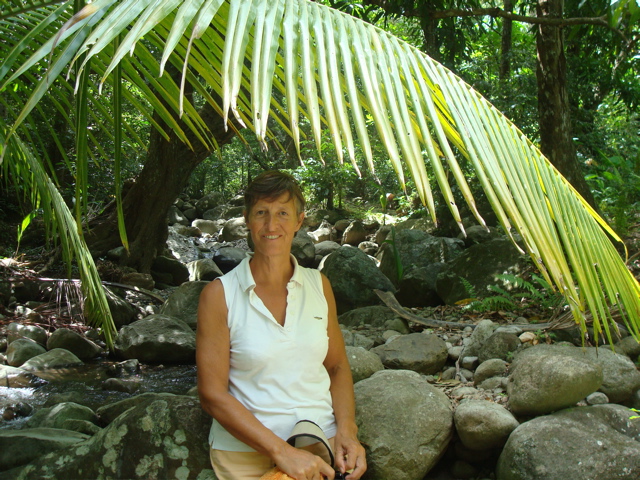 Partout les rivières se jettent dans la mer. Il y en a 365 en Dominique (comme par hasard !) et nous profitons d'un petit bain d'eau douce en tenue d'Eve (sauf pour la photo !) sous le seul regard d'un petit lézard curieux qui se rengorge.