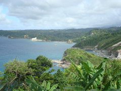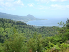Mais c'est surtout pour l'intérieur de l'île que nous venons en Dominique. Cette fois-ci, nous décidons de louer une voiture et de partir à la découverte à notre rythme. Nous empruntons la North Bound Road et nous retrouvons rapidement entouré d'une végétation exhubérante. Fougères arborescentes, bananiers, manguiers, cocotiers, arbres à pain, balisiers et tous les autres spécimens dont les noms nous échappent bordent la petite route qui grimpe la pente parfois bien abrupte. Heureusement nous avons un 4x4 et nous pouvons engager la rampante quand il le faut ! Nous nous arrêtons pour profiter des vues plongeantes sur la mer et les îles proches, Les Saintes et Marie-Galante.