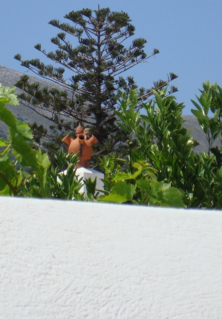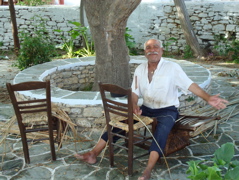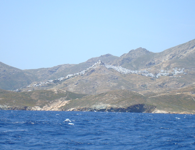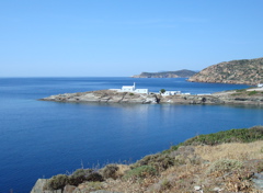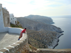 Quand le guindeau arrive enfin, le barbotin n'est pas adapté à notre chaîne ! Nous reviendrons sur Paros plus tard en récupérer un autre, mais en attendant, cap sur la belle Sifnos. Ses atouts sont la variété des paysages, tantôt agricoles, tantôt arides, ses belles villes plus vivantes qu'ailleurs car plus habitées toute l'année, ses poteries renommées qu'ils utilisent même pour faire des chapeaux de cheminée. Mais la palme revient au monastère de Chrissopigi, tout blanc sur son rocher au milieu de l'eau bleue et au village médiéval de Kastro, perché une une colline dominant la mer avec chemin de ronde, passages voûtés et toujours ces belles maisons peintes en blanc. Mais combien de kilos de peinture utilisent-ils chaque année ? Nous rencontrons dans le tout petit port du nord de l'île un couple d'australien en croisière. Discussion croisée en australien-anglais, franco-anglais et greco-anglais avec le patron de la taverne.