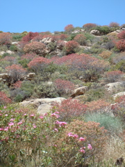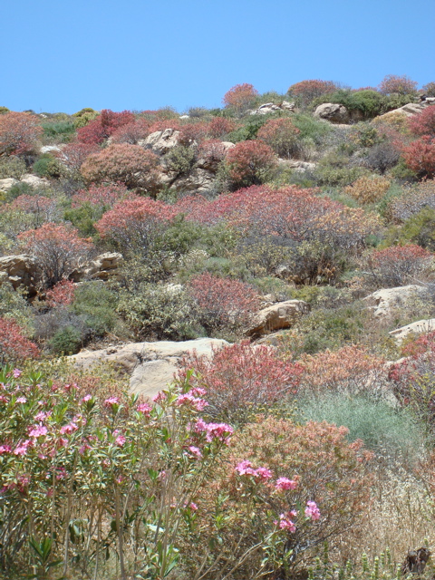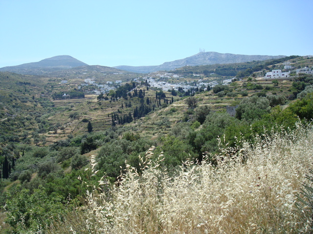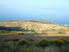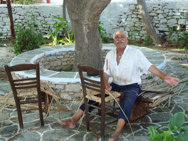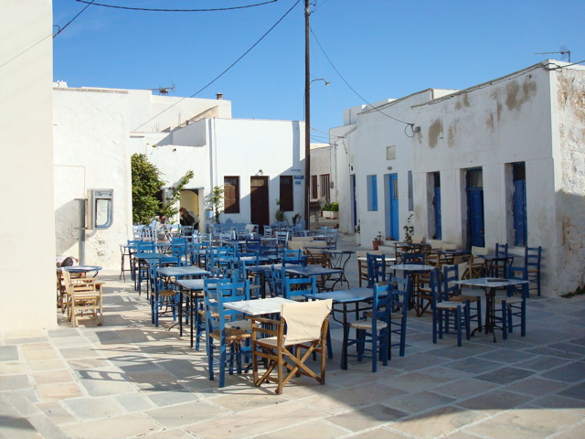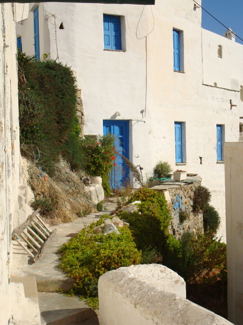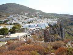 Folegandros, qu'on nous avait beaucoup vanté, est une île rocailleuse et aride. On a l'impression que les cailloux poussent dans les champs ! La chora est au bord de la falaise vertigineuse et la vue sur la côte nord de l'île est superbe, surtout en montant un peu sur le chemin qui mène à l'église. Comme les rares habitants ne vivent que du tourisme, on a la fâcheuse impression qu'ils voient en nous, à chaque coin de rue ou de terrasse, un consommateur. Les chaises sont en attente, comme partout ailleurs, mais là elles attendent le rempailleur ! Comme les peintres en bâtiment, les rempailleurs ne sont pas au chômage en Grèce.