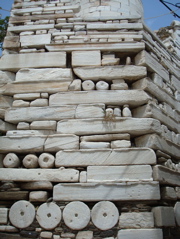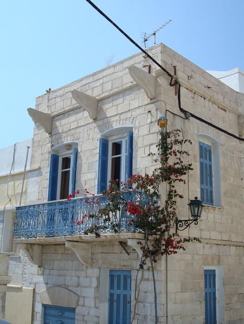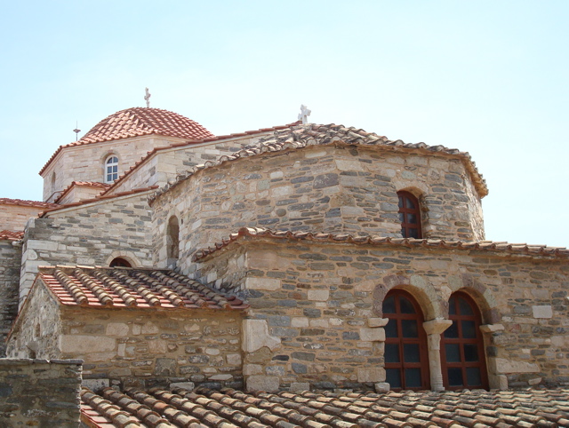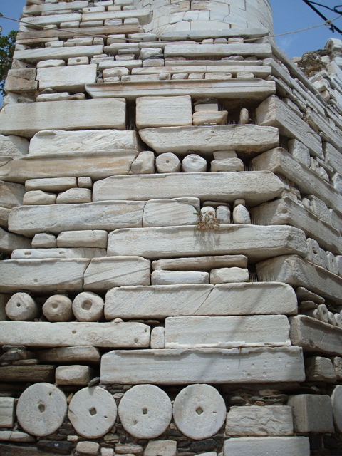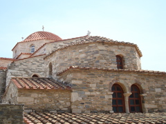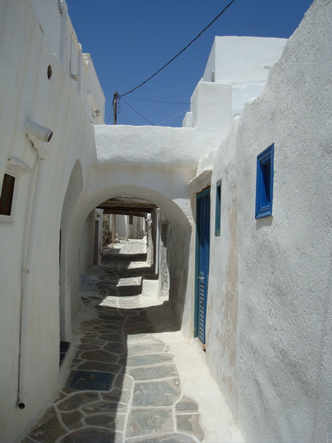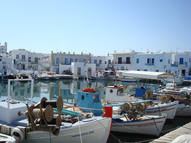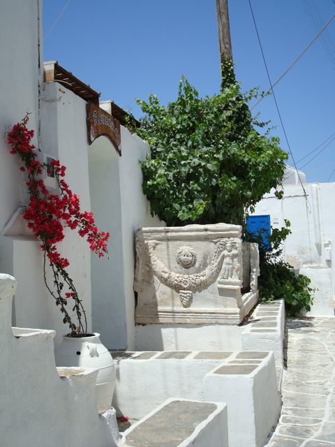 Sur Paros, nous sommes surpris et heureux de retrouver un paysage plus agricole. Le vert des vignes, des oliviers, des figuiers joue avec le jaune des champs de blé. Naoussa aligne les tavernes le long de son port de pêche minuscule mais c'est dans un ruelle cachée qu'une odeur délicieuse et irrésistible nous pousse à réserver une table pour la soirée. Le restaurant "Le Sud" offre une cuisine française raffinée qui nous enchante, nous qui n'avons pas encore trouvé beaucoup de plaisir à la cuisine grecque. Parikia nous offre de précieux services : laverie, quincailler, supermarché, shipchandler. Nous commandons un nouveau guindeau pour relever l'ancre car nous sommes déjà tombés en panne deux fois avec l'ancien et il fonctionne maintenant par la force de l'araldit ! Pas très sécurisant quand on mouille l'ancre pratiquement tous les jours. En l'attendant pendant trois jours, nous avons le temps de visiter mieux la ville, son kastro vénitien du XIIème siècle, fait de vestiges de temples et monuments antiques. On dirait une construction d'enfants en Lego. L'église orthodoxe Katapoliani est une des plus anciennes église orthodoxe de Grèce et date du IVème siècle. Elle cache ses toits de tuiles rouges et ses murs en blocs de pierre de différentes teintes derrière de hauts murs d'enceinte blancs. J'ai eu de la peine à la trouver mais, par chance, un groupe de français avec un guide était sur les lieux et j'ai pu profiter des explications !