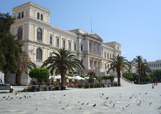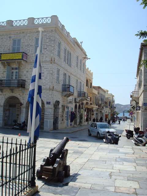 Sur l'île de Syros, nous apprécions la ville d'Ermopoulis, capitale administrative des Cyclades. Belle ville à l'architecture neo-classsique, aux rues dallées et au port actif qui a perdu de son importance commerciale à l'ouverture du canal de Corinthe puisque les bateaux s'y arrêtaient pour se ravitailler avant de faire le tour du Péloponnèse.