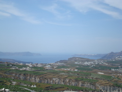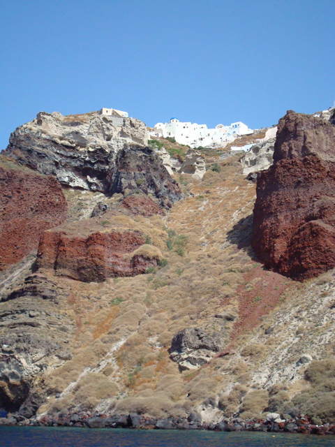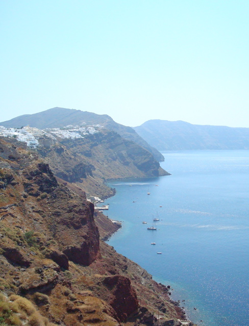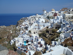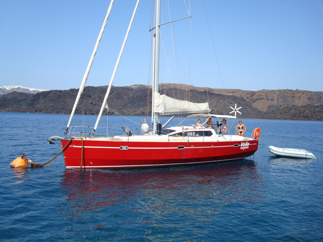 A Santorin, nous commençons par repérer le joli RM 1250 de Voiles Magazine au m ilieu du cratère. Nous avions déjà rencontré à Monastir. Nous allons les saluer et ils nous donnent un bon plan : des bouées rouges sont à disposition des voiliers sous la falaise de Oia, le plus beau village de l'île. Nous abandonnons l'idée du port au sud et faisons demi-tour. Nous ne le regretterons pas. Le spectacle des maisons accrochées au dessus de cette falaise bariolée et la vue sur tout le reste du cratère est fabuleuse. La montée des marches le matin pour aller louer un scooter l'est autant ! Pas de mulet à cette heure-là ! Le reste de l'île offre des contrastes saisissants entre l'abrupt du cratère, à l'intérieur et la douceur des paysages agricoles à l'extérieur, entre les hôtels de luxe de Thira et Oia et les méthodes ancestrales de battage du blé. Contraste aussi entre la foule déversée des autocars, qui suit un petit panneau tenu par un guide, et notre mouillage solitaire au pied de la falaise. Que l'on est bien en bateau ! Difficile de repartir de cet endroit magique.