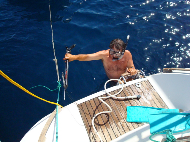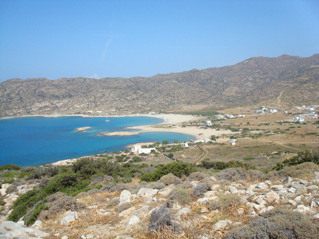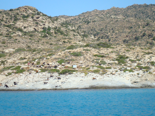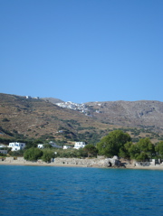 Même si nous ne nous arrêtons qu'une nuit sur Ios, c'est dans la belle baie aux eaux turquoises, Manganari. On se croirait aux Antilles. Le Routard parle de rendez-vous de tous les yachts du monde et de jeunes (filles, dans l'esprit de Pierre) nus sur la plage. Résultat, on est seul au mouillage et il n'y a que des chèvres sur les rochers ! Mais la vue depuis la colline est magnifique. On arrive dans le pays du Grand Bleu. Une partie du film a été tourné dans cette baie, une autre dans l'île suivante, Amorgos. Et puis Pierre découvre qu'il y a des soles sur le sable sous le bateau. Il dégaine son fusil sous-marin et ... revient avec une toute petite sole que nous dégusterons en entrée !