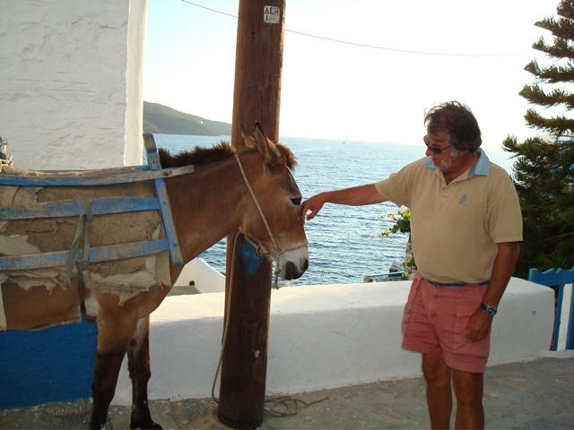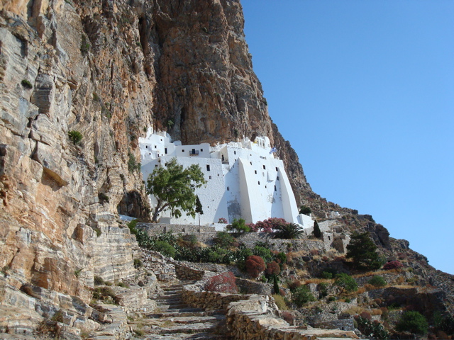 Si Amorgos est connu par le film de Besson, elle l'est aussi pour l'incroyable monastère de la Panagia Chozoviotissa (qu'on voit aussi dans le film). Des moines sont venus de Palestine au XIème siècle pour imprimer cette tâche blanche dans ce décor vertigineux de rochers rouges. Ils ont amené la Panagia, une icône de la madone que l'on peut voir dans la petite chapelle. Mais pour entrer, tenue correcte exigée. Le premier jour, j'avais oublié la jupe longue et la blouse pour couvrir les bras. Nous sommes revenus le lendemain. Depuis Santorin, je ne crains plus les grimpettes ! Le monastère est plaqué contre le rocher et à l'intérieur, la roche est apparente. Les pièces sont étroites et la vue plongeante sur la mer depuis les petites fenêtres vaut le déplacement. Le pope ne doit pas descendre bien souvent, vu son embonpoint. Il doit plutôt rester là-haut et manger en cachette les loukoums et biscuits qu'il offre aux visiteurs à leur arrivée. L'avantage des mouillages d'Amorgos, c'est leur vue sur le coucher du soleil... et on en profite. Et quel plaisir de se promener dans ces petits villages où il y a encore de vieux grecs (des moins vieux aussi !) qui tiennent leur petite épicerie, qui se promènent avec leur mulet (Pierre commence à les apprivoiser !) où qui sirotent un ouzo sous une treille.