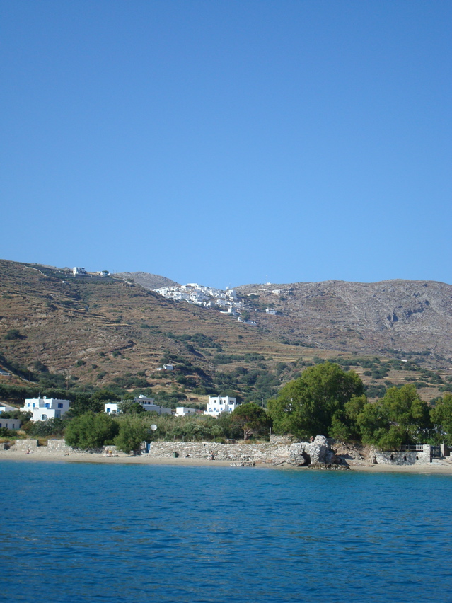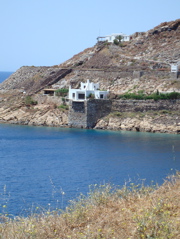 Notre premier coup de coeur fut pour Sérifos : première chora, capitale de l'île toute blanche perchée sur un éperon rocheux, garrigue en fleur dégageant des odeurs de sauge, d' "herbe à maggi", dont on profite bien en scooter, belles plages au fond de baies profondes. Nous parcourons les ruelles étroites fraîchement blanchies, grimpons courageusement les escaliers aux marches toujours plus hautes et nous régalons de la vue depuis les petites chapelles au sommet de la ville. Nous voyons Anegada, tout petit au mouillage. Sur la place couverte de chaises attendant l'affluence de l'été, nous buvons un ouzo, le premier que nous apprécions vraiment, car le cadre est idéal. Le patron du bar parle bien français et nous fait découvrir un peu la réalité de la vie de Sérifos : le long hiver (pourri cet année) où la chora est déserte, les rénovations des maisons grâce aux athéniens, mais aussi beaucoup aux français qui lui redonnent vie et allure ces dernières années et puis ces deux mois d'été où l'île déborde de monde. Il nous conseille aussi pour notre visite du lendemain dans la région minière du sud de l'île, une région où même la végétation prend des couleurs de cuivre et de bauxite. Nous admirons les villas modernes ou les bungalows qui s'intégrent très bien dans le paysage. Certaines reprenant même des éléments anciens, comme ce mur de chargement des anciennes mines. Elles sont la plupart du temps fermées puisque la saison dure ici deux mois. Parfois, des carcasses en béton abandonnées gâchent le paysage, tout en essayant de jouer les temples grecs le soir au coucher du soleil. Il paraît que les grecs ont l'habitude de commencer une construction et de la terminer petit à petit, quand ils en ont les moyens. En attendant, dommage pour le paysage.