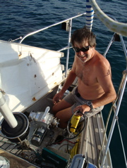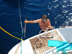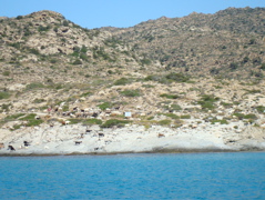 10 noeuds du sud-ouest, sous spi en direction d'Amorgos, à l'ombre du bimini... que raconter de ces 350 milles à zigzaguer dans les Cyclades ? De très belles navigations, pratiquement toujours à la voile et même souvent sous spi, sur une mer désespérement vide de poissons et de dauphins (quoique, à peine j'écris cela que nous en apercevons deux de loin!). Pierre met pourtant sa ligne avec persévérance à chaque traversée en se disant que 100% des gagnants au loto avaient tenté leur chance.
