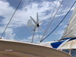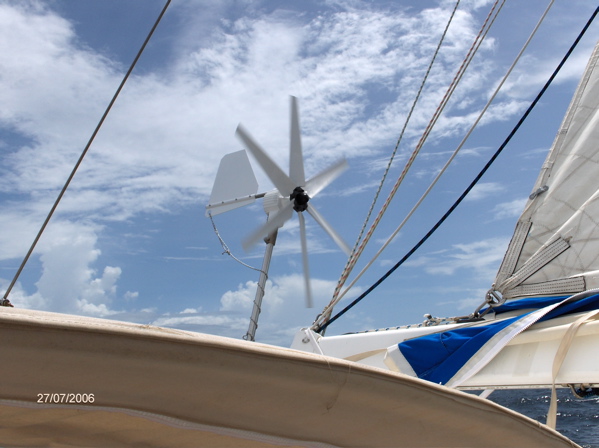 Pour mon anniversaire, Pierre me fait la surprise d'acheter... enfin... une éolienne. Il n'était pas convaincu, trouvant que 7 Ah de charge c'était bien peu. Mais maintenant il est tout heureux de se lever le matin avec des batteries chargées. Peu... mais longtemps, cela finit par faire beaucoup ! Pour cela, il faut tout de même du vent ! Après deux jours de travail, d'aller et retour au chantier pour trouver des tubes, des embouts, des câbles, de contorsions pour passer les fils, d'équilibrisme pour monter le tout... le vent est tombé. Impossible de voir si cela fonctionne. D'après nos voisins français qui nous ont dépannés quand la perceuse a rendu l'âme, c'est classique. Pour chaque éolienne installée, il y a quelques jours sans vent. C'est peut-être le prix à payer à Eole pour le faire travailler ensuite gratuitement !