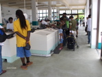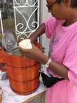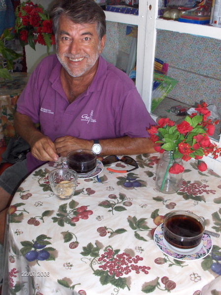 Quand nous sommes proches de la civilisation, nous avons plaisir à aller boire un café à terre. L'expresso n'est pas souvent au rendez-vous ! Le plus drôle c'est quand la serveuse arrive avec les tasses et sous-tasses, la cafetière en porcelaine, le sucrier, parfois même les sets et finit par amener le pot de café soluble. Nous avons aussi de la peine à résister aux marchandes de sorbets dans la rue. La sorbetière est faite d'un récipient en métal entouré de glaçons, le tout dans un seau en bois équipé d'une manivelle pour tourner le sorbet, souvent au coco, et le faire prendre.