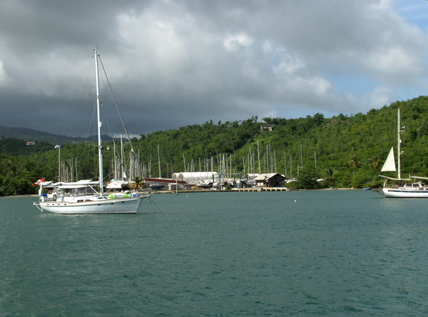 Après deux jours passés près de Sandy Island, petit paradis pour pélicans mis à mal par deux cyclones et protégé maintenant par une fausse barrière de corail mort, nous profitons de la lune bientôt pleine pour retourner au sud de Grenade. C'est une magnifique navigation nocturne (malheureusement au moteur par manque de vent !). Il faut à nouveau enlever et ranger voiles et tauds, vider les réserves de tout ce qui pourrait attirer les petites bêtes, faire les grands nettoyages et abandonner Anegada sur un autre chantier (Grenada Marine) un peu plus protégé en cas de cyclone... et croiser les doigts jusqu'au mois de décembre.