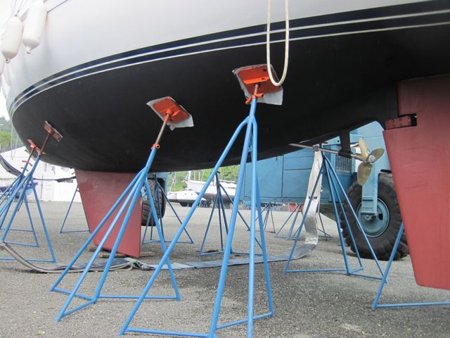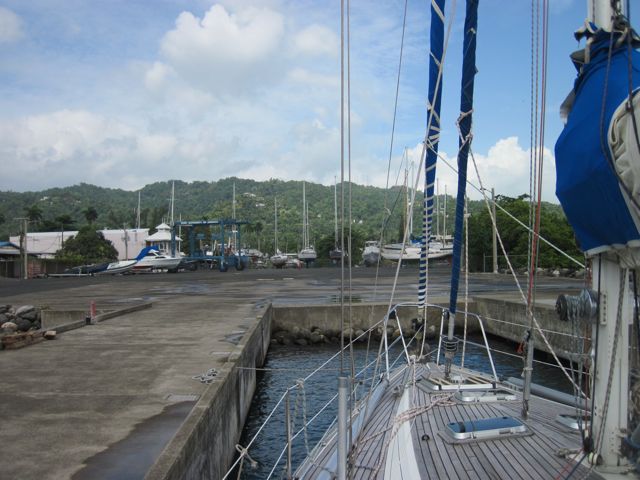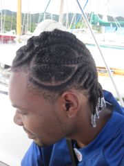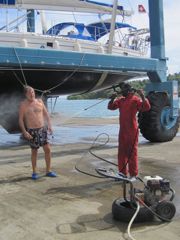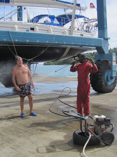 Mais notre principale activité en Jamaïque, c'est la sortie du bateau. Le chantier en dur, très propre, est quasiment vide. Le matériel, grue, ber, est en très bon état et Georges, le responsable, est un homme en or. Serviable, précis, attentif, c'est lui qui manie la grue. Pierre profite du karcher pour prendre une douche revigorante. Nous passons deux jours hors de l'eau et engageons Presley qui propose ses services à tous les bateaux en espérant un job. Comme nous le dit avec humour Patrick, notre voisin jamaïcain, il a bien appris des anglais et empoche l'argent en sous-traitant le travail à ses copains et en en faisant le minimum lui-même. Pierre s'énerve, comme d'habitude, car il aimerait la qualité de service suisse aux prix jamaïcains ! Finalement l'antifouling est posé, rouge pour les appendices et noir pour la coque car nous n'avons trouvé que deux bidons de noir ! Nous profitons de repeindre, de notre côté, les lignes bleues au-dessus de la flottaison, qui devenaient plus dentelle que ligne ! Nous espérons que nos ouvriers vont attaquer le polish, mais la moindre petite averse les fait fuir pendant plusieurs heures et quand ils reviennent, c'est pour réclamer leur argent ou des bières en nous disant que de toute manière ils peuvent aussi polisher à l'eau, plus tard. Seul Jason, un jeune Jamaïcain à la coiffure incroyable a vraiment mis du coeur à l'ouvrage. Papa d'une petite fille de 15 mois, cela le motive à travailler pour sa famille. Il veut mettre de l'argent de côté afin de se payer une école professionnelle et devenir policier. Malheureusement, ce n'est pas avec lui que nous avons établi le contrat, il nous faut attendre le bon vouloir de Presley. Finalement, nous perdons patience et remettons le bateau à l'eau.