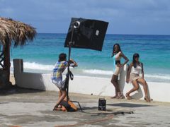 En partant du côté est, nous découvrons de superbes baies aux eaux turquoises et des petites plages idylliques. Un jeune s'entraîne en planche à roulette et me fait bien penser à Yann qui passait des heures ainsi à passer d'un obstacle à un autre. Je le fais poser pour la photo en lui parlant de Yann et lui demande s'il ne s'est encore rien cassé... Un bras seulement ! Un peu plus loin, la forêt laisse la place à de vertes prairies avec des vaches. On dirait les Açores ! Nous nous arrêtons sur la plage de Long Beach, où Lolo venait faire du surf tous les jours (avis aux amateurs) pour profiter d'un spectacle étonnant : séance photo avec deux mannequins pour un journal de mode.