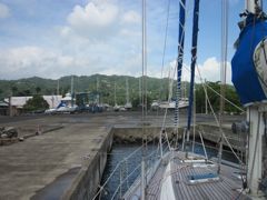 Le lendemain au réveil, nous découvrons une magnifique baie entourée de végétation luxuriante, de petite maisons colorées cachées dans les arbres. Pierre me dit : "On dirait Grenade !" De plus, l'eau du mouillage est claire et incite au bain matinal. Un employé de la marina approche en zodiac et nous amène de la documentation et des papiers à remplir pour les clearences. Quelle organisation ! Une fois ces papiers remplis, nous devons aller à quai avec le bateau pour la visite de la "Quarantine". Une jeune femme vient à bord, nous pose quelques questions sur notre santé, inspecte quelques placards, les WC et nous donne ensuite l'autorisation de descendre à terre. Nous attendons encore la douane et l'immigration. Pierre est impatient et part faire quelques courses, repérer les supermarchés et retirer de l'argent. Heureusement, car à 17h30, les autorités n'ont toujours pas passé. Il faut dire que c'est samedi et que les choses sont nettement plus décontractées qu'à Cuba ! Au secrétariat de la marina, on nous dit de ne pas nous en faire, qu'on pourra faire le nécessaire lundi. Nous pouvons retourner au mouillage et nous préparer pour la "party".