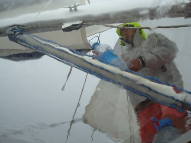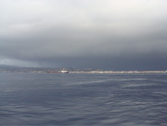 14 septembre 08 : Bon calcul... nous passons le détroit au lever du jour. C'est mieux pour éviter les nombreux bacs, ferries et cargos qui croisent par là. Le courant est avec nous. Les remous ne sont pas trop forts. Par contre, une mauvaise mer croisée nous attend de l'autre côté et nous mettons 8 h à parcourir les 34 nm qui nous séparent de VVulcano. Le moteur n'a pas chômé aujourd'hui ! Plafond bas, grains violents, grosses averses... On voulait un jour de pluie, on l'a ! C'est bon... vous pouvez arrêter maintenant ! |