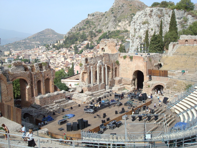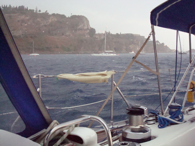 12 septembre 08 : Le thermique espéré ne se lève pas. C'est au moteur que nous rejoignons Taormina en passant devant l'Etna. Mouillage sous le cap, à côté des bouées payantes proposées à 30 euros la nuit (50 normalement, on nous fait un "cadeau !) Dire qu'il y a quelques années la Sicile était bon marché pour le navigateur car on se mettait grauitement au ponton des pêcheurs dans n'importe quel port ! Maintenant il y a des pontons organisés partout, à des prix impossible (100 euros la nuit à Messine, + 10 euros pour l'eau !) |