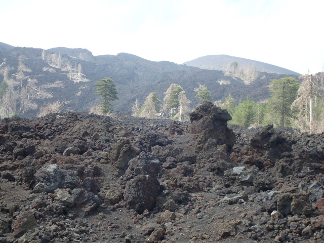 13 septembre 08 : On se déplace à Giardini-Naxos pour louer un scooter, monter à Taormina et voir le fameux temple grec. Promenade dans les rues envahies de touristes. On s'enfuit sur les pentes de l'Etna. Repas délicieux à Linguaglossa dans une petite échoppe qui ne paie pas de mine. Cuisine maison bien meilleure que celle de la trattoria de l'autre soir recommandée par le Routard. L'Etna est dégagé et nous montons jusqu'aux pistes de ski et à la coulée de lave datant de 2002. Impressionnant. Pour aller plus haut, il faudrait prendre un tour organisé en 4x4 puis marcher. Pas pour nous !