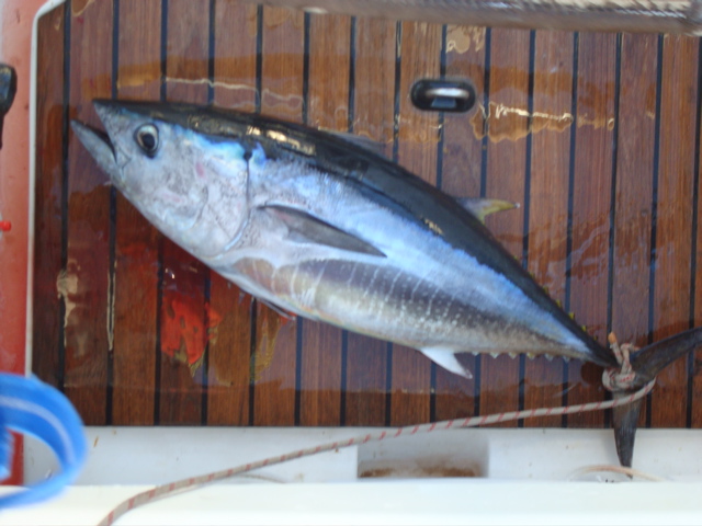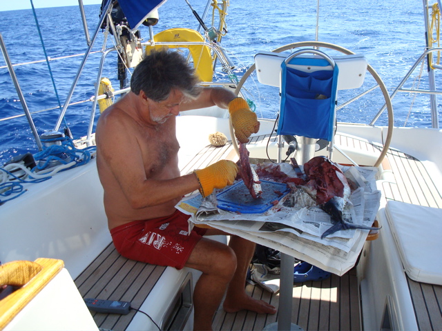 Entre 8 et 9h du matin, on sort deux thons. D'habitude, on se contente d'une prise, mais Pierre est tellement frustré de pêche depuis la Grèce qu'il ne résiste pas à remettre la ligne. On sait ce que l'on va manger ces prochains jours !