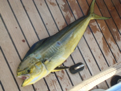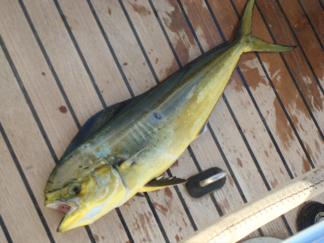 Une petite coryphène (lampuka tunisienne) mord à l'hameçon... c'est bon signe. Coïncidence ? Cela fait 10 ans, à un mois près, qu'on a pêché notre première coryphène pratiquement au même endroit, près de l'île d'Ustica.On traversait déjà entre la Sicile et la Sardaigne avec notre premier Anegada. La coryphène est ensuite devenu notre poisson préféré en Atlantique, où elle est beaucoup plus grosse.