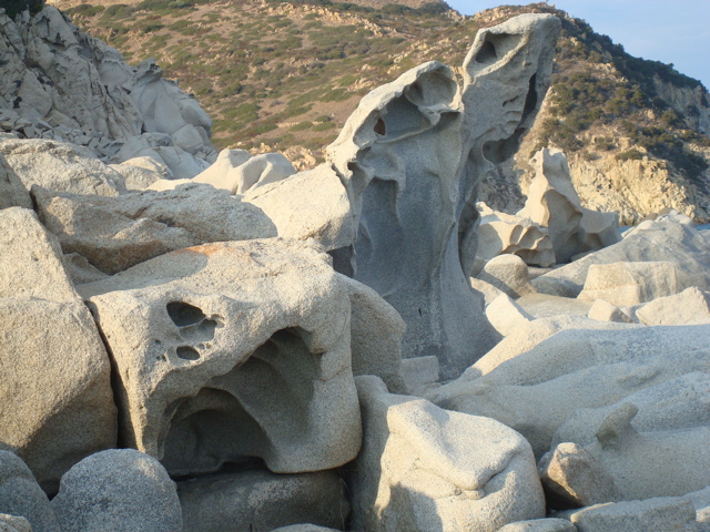 20-21 septembre 08 : Après un coup de vent d'ouest et une grosse averse, le mistral se lève et balaie le ciel. Nous nous abritons à l'est du Cap Carbonara, le long de la belle plage de sable blanc. On se croirait aux Antilles. Mais la protection est relative et la houle nous secoue toute la nuit (on a l'habitude mais c'est désagréable !). Après une longue balade qui nous amène au village de Villasimius, on se déplace plus au nord, derrière une petite langue de sable qui nous protège bien. Les paysages sardes sont vraiment superbes avec ces rochers erodés par le vent. |