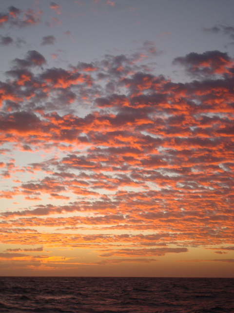 Samedi 6.12 au mercredi 10.12 : Traversée sans problème... que cela fait du bien ! Le vent de NE nous reste fidèle tout du long, nous ne mettons le moteur qu'une dizaine d'heures sur cinq jours ! Les deux premiers jours, la houle secoue un peu mais ensuite, la mer se calme et nous offre une navigation de rêve. Les dauphins viennent nous voir tous les matins et jouent longtemps à l'étrave. Le ciel, couvert au début, se dégage petit à petit et les nuits sont étoilées et douces, les aurores colorées. On fait nos quarts en écoutant de la musique, en lisant ou en somnolant. Pas de cargo à l'horizon... ! Les deux dernières journées se font même sous spi, à 8 noeuds. On a peur d'arriver trop vite car on ne veut pas faire l'atterrissage de nuit. A l'aube du 10 décembre, nous apercevons l'île de Sal. Je réveille Pierre car c'est le dernier moment pour tenter la pêche, qui ne nous a pas souri pour l'instant. Il met ses lignes plein d'espoir car nous sommes à l'endroit de la remontée des fonds de plus de 1000 m à 100 m. On ne tarde pas à entendre le bruit caractéristique... enfin ! Mais l'espoir est de courte durée car deux minutes plus tard, il ne reste rien au bout de la ligne. Pierre retente le coup. Cette fois-ci, on voit des dauphins sauter derrière nous. Poursuivent-ils des poissons ? Nous avons une nouvelle touche, mais à nouveau il ne reste que le fil. Le rapala a été englouti ! Par les dauphins ? cela ne nous est jamais arrivé... par des requins ? On ne le saura jamais.