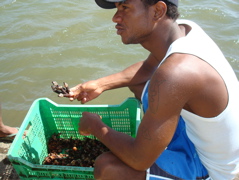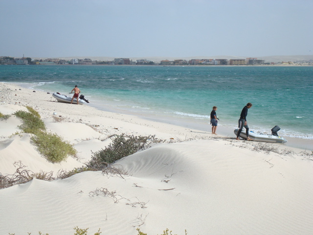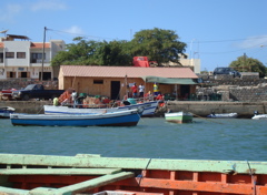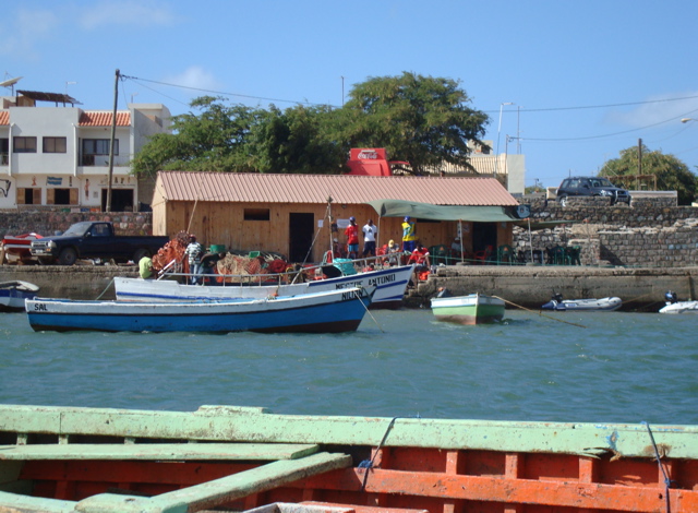Nous mouillons dans la baie de Palmeira à Sal et récupérons de nos efforts. Accueil sympa, en français, par Zidane, un jeune capverdien que Jean-Claude nous avait recommandé. Il nous donne toutes les infos nécessaires sur le mouillage et nous demande de nous déplacer pour laisser les cargos manoeuvrer. Comment expliquer nos premiers sentiments sur le Cap Vert? Nous sommes sur nos gardes car on entend beaucoup parler de vols, vols d'annexe en particulier. Nous la cadenassons, mais nous sommes apparemment les seuls. Il faut dire qu'elle est un peu plus grande et "luxueuse" que les autres. Nous débarquons devant le local des pêcheurs. C'est animé et plutôt accueillant. Chaque fois que nous engageons la conversation, comme avec le pêcheur de pousse-pieds, on nous répond très gentiment, souvent en français. Nous avions entendu parlé de la gentillesse des capverdiens, ce n'est pas une légende.