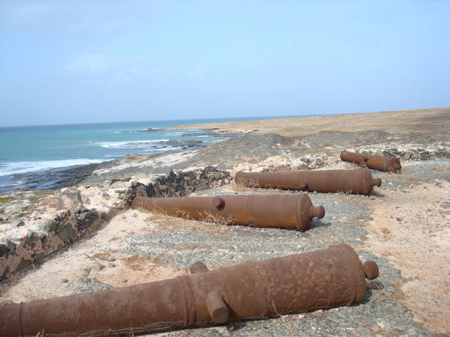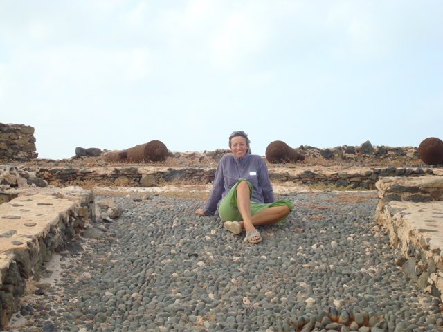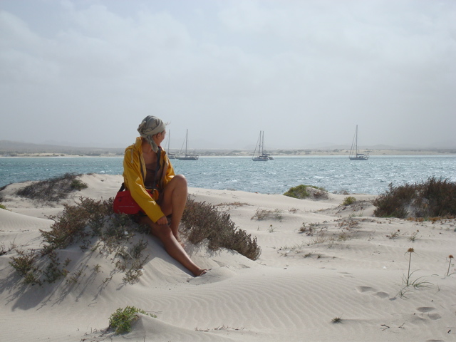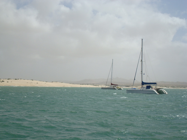 Mercredi 17.12 : Malgré mes prévisions optimistes, le vent est toujours là. En fait, cela fait depuis dimanche que j'annonce que "demain" ça va se calmer ! (Cela doit rappeler des souvenirs à certains !) Personne ne me croit plus et tout le monde en a marre. Les 50 m qui nous séparent de Vagualarme paraissent parfois infranchissables et sont du moins très humides. Heureusement, il y a la VHF pour communiquer. Ce matin, les hommes décident de tenter une partie de pêche sous-marine sous le vent de l'île voisine. Avec Cordélia, nous optons pour une balade sur l'île en papotant. Passé la plage couverte de détritus amenés par le vent, la mer mais aussi les visiteurs, le paysage est fait de dunes couvertes de graminées et de buissons bas et secs. Les ruines d'un ancien fort datant de 1818, qui servait de refuge aux habitants de Boavista lors d'attaques de pirates, offrent un beau point de vue sur l'île et le mouillage. L'eau est encore trop agitée et trouble et les hommes rentrent bredouilles. Nous en avons tous assez de cette île qui ne se laisse pas approcher et pensons partir demain. Ce soir, dernier apéro avec Goyave et Vagualarme avant que nos routes se séparent à nouveau. Pour nous, la prochaine étape sera Tarrafal sur Sao Nicolau, Goyave part sur Sal et Vagualarme sur Santiago où la famille de Cordelia débarque pour les fêtes. Ces quelques jours ensemble ont été bien sympa malgré les conditions difficiles.