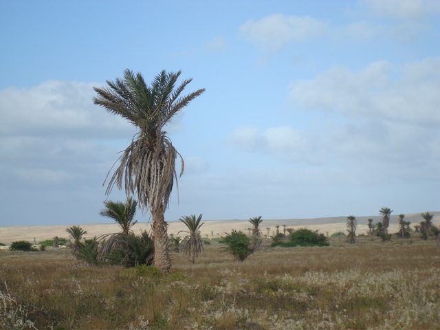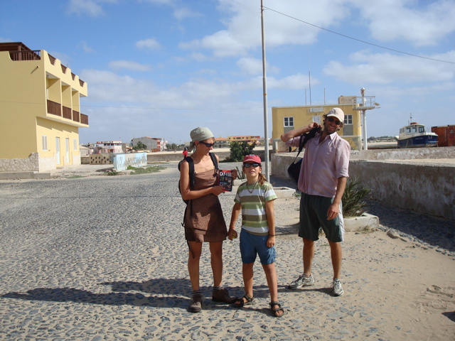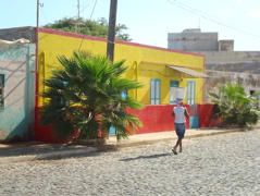 Pour aller chercher des escudos, nous devons nous rendre à Espargos, la ville principale de l'île. Nous y allons en taxi collectif, l'aluguer. Un sénégalais essaie de nous vendre des T-shirt. Premier constat... ce sont les sénégalais qui abordent les touristes et vendent les souvenirs... Deuxième constat, l'île est vraiment aride, plate et sans grand intérêt. Troisième constat en ce qui concerne la pauvreté : notre hiver en Tunisie nous a un peu habitué à ce type d'habitat sans fioriture, aux détritus abandonnés partout. Nous trouvons tout de même que les habitants, à Sal du moins, semblent moins démunis que ce que nous pensions. Beaucoup ont des téléphones portables, les jeunes sont habillés à la mode, avec des habits "de marque" comme en Tunisie. On sent que le tourisme, très présent dans le sud de l'île, a amené un peu de confort. Mais il paraît que Sal est l'île la moins représentative du Cap Vert. Alors attendons. Le plus joli, ce sont les petites maisons colorées, les femmes qui portent les charges sur la tête et les enfants dans le dos... petit côté africain !