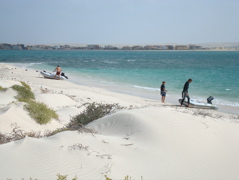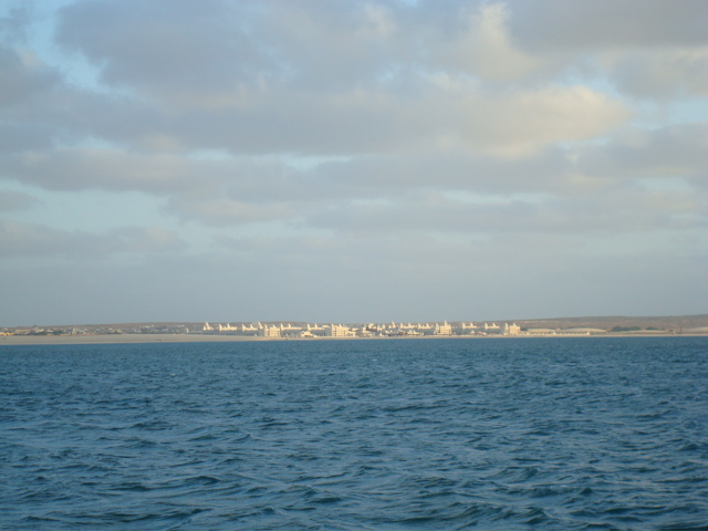 Au loin, nous apercevons un hôtel surréaliste, que nous avons aussi remarqué depuis le mouillage. L'hôtel Rio, construit par les espagnols et ouvert il y a deux semaines, tient tout du mirage quand on le voit depuis le bateau à travers les brumes de l'harmattan. Il a l'air bien vide pour l'instant. Pendant ce temps, Pierre a découvert la pêche depuis le bateau. Avec les coquillages ramassés sur l'île le matin comme appât, il attrape plusieurs sars de belle taille. Il se venge de la pèche à la traîne !