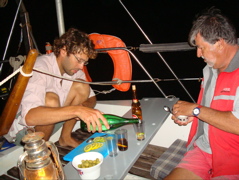 Apéritif le soir sur Goyave, le catamaran de Christian et Maryse qui a dérapé pendant leur virée sur l'îlot voisin. Pierre et Pascal sont allés le récupérer. On échange des infos sur les destinations anciennes et futures, des trucs de pêche, tout en dégustant des petits coquillages, fruits de leur récolte de l'après-midi sur l'îlot. Ils ont passé 16 mois en Afrique (Casamance, Sénégal, Gambie) et sont de vrais voyageurs racontant quantité d'histoires intéressantes.